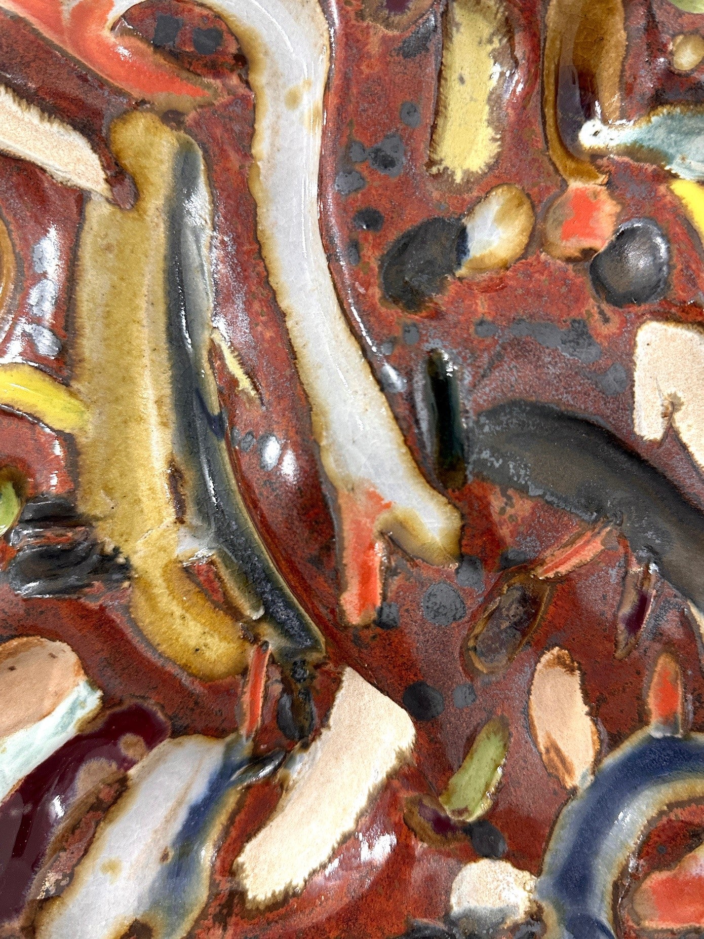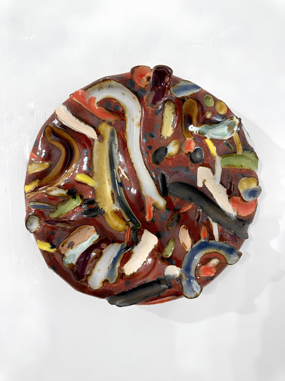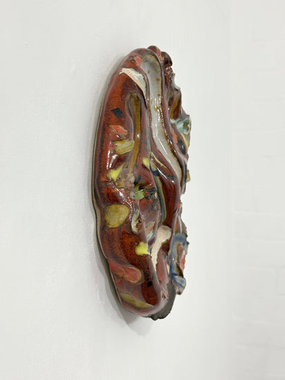 These wall mounted stoneware painting follow on from my ‘Stone’ series of smooth, thrown hollow forms. I was looking to put a bit more gesture and expression into my throwing style and to disrupt that perfect symmetry - a re-visit to my earlier practice as a painter. The glazes are painted on. I was hoping the kiln would give me unexpected melts and contaminations. The results have a kind of elemental, cosmic appearance, either interstellar or microbial in nature.