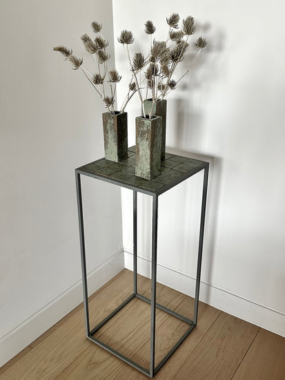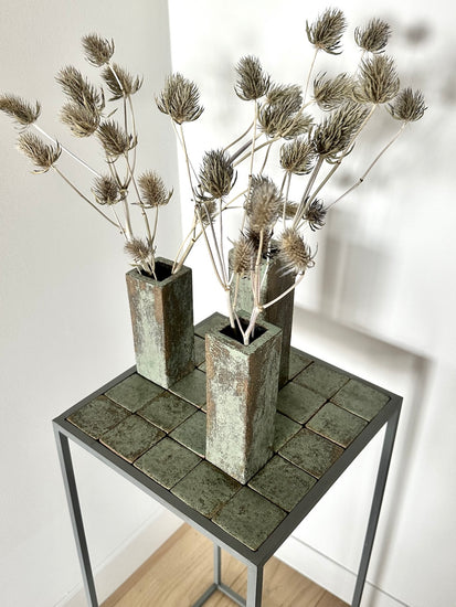 Verdigris coloured/textured tiles with three vases atop a matte grey painted metal frame.