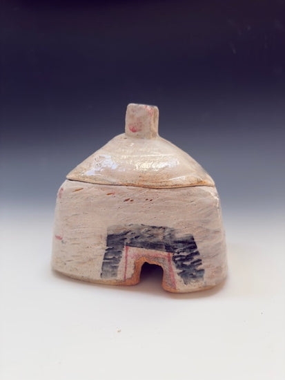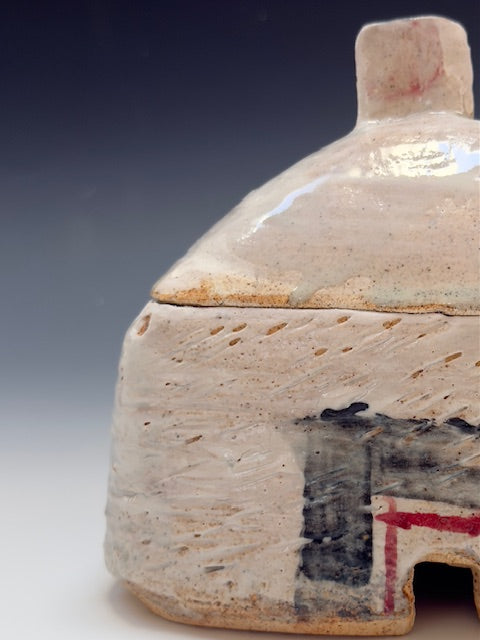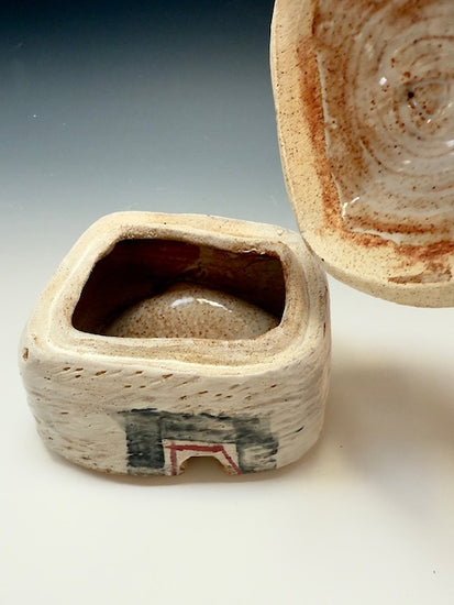This lidded box is based on my interest in images of African mud huts. I think of houses and apartment spaces as modern huts, places of containment where we live most of our lives. The boxes where we dwell, sleep, and eat become a portal to our perception of ourselves. Inside every living space is the hidden energy of the person inhabiting that space; sometimes the energy can’t be contained. What I love about lidded vessels is the compulsion to raise the lid and see inside; it’s almost impossible for me not to lift a lid on a jar when I’m looking at one. Maybe that curiosity in me grew because of my experience of being raised in a California suburb and never knowing (but somehow instinctively understanding) that behind each manicured and quiet house lived secrets and shame, embarrassments and joy.