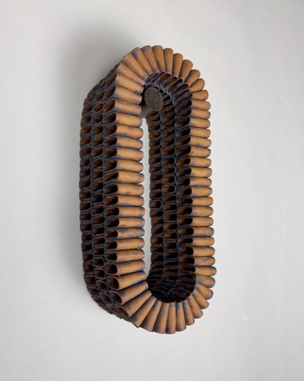 Her work explores the dialogue between containment and openness. The forms feel both solid and porous, revealing their internal scaffolding and celebrating the underlying patterns and structures that often go unnoticed beneath the surface. Repetition and methodical sequencing create rhythm and coherence, echoing architectural and craft practices and creating a rich complexity in the simplest of forms.