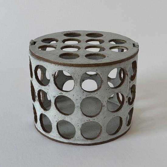 In relation to ‘What Holds’, I am interested in how the act of containment can both protect and restrict, hide and put on display. While boxes and lidded forms often give the ability to close, safeguard and hide, my work interrupts this expectation. The pierced, irregular grids let air and light through and expose their contents. Rather than concealing its interior, the structures hover between openness and enclosure, between hiding and revealing.