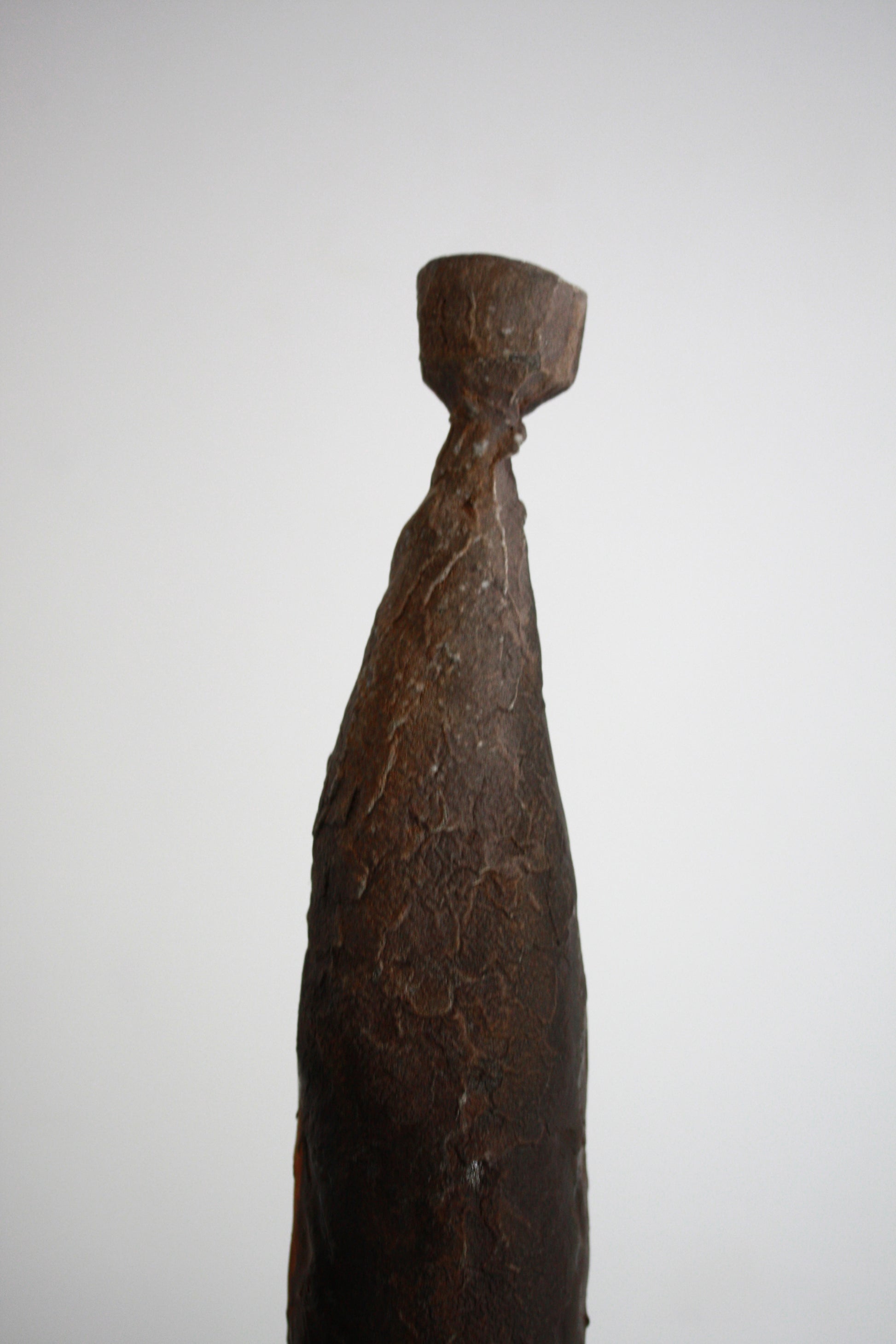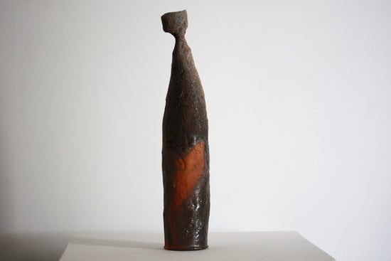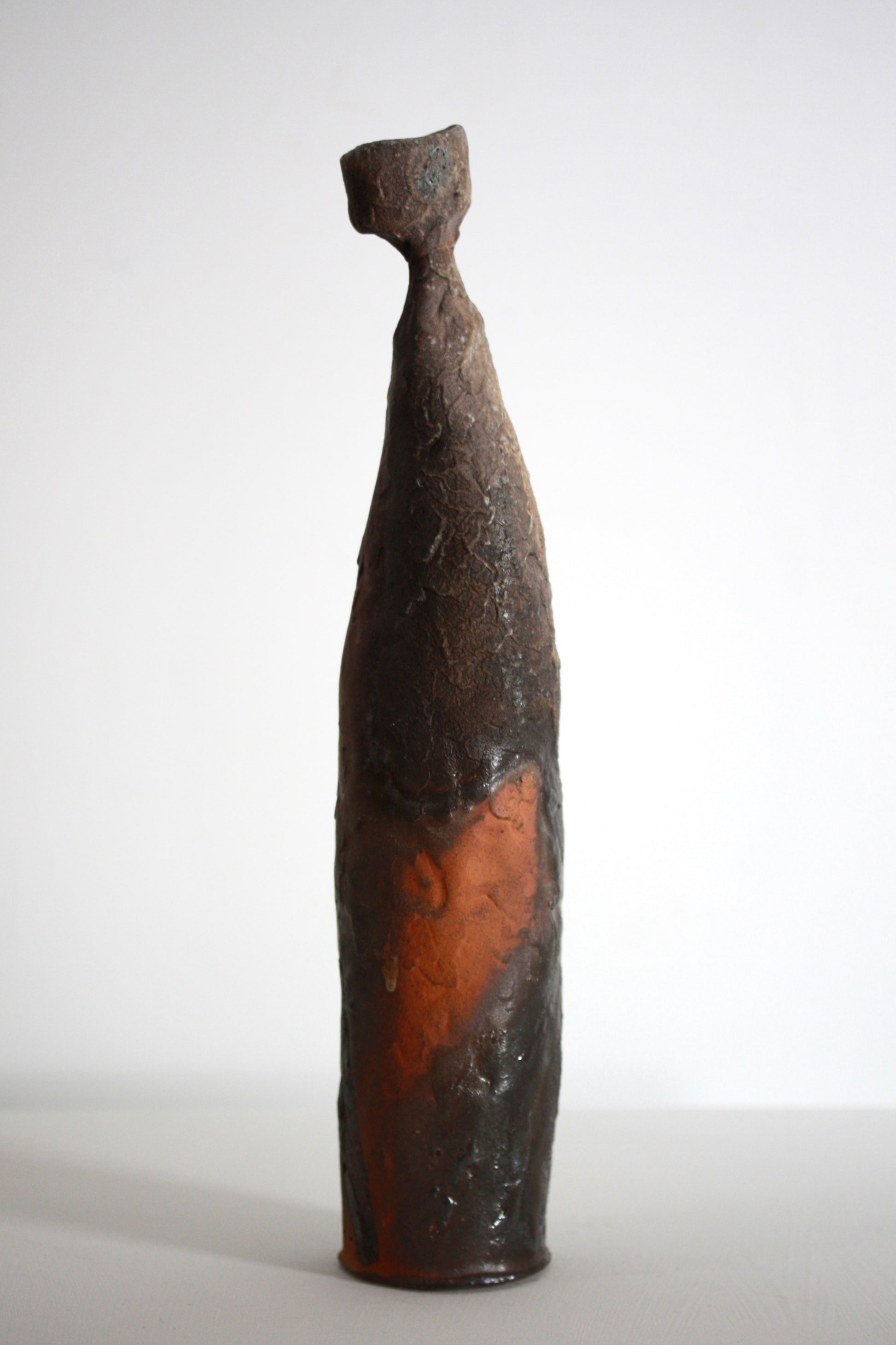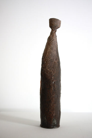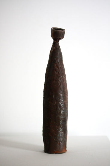 Coil built candlestick in stoneware clay. Wood fired in an anagama kiln and reduction cooled.