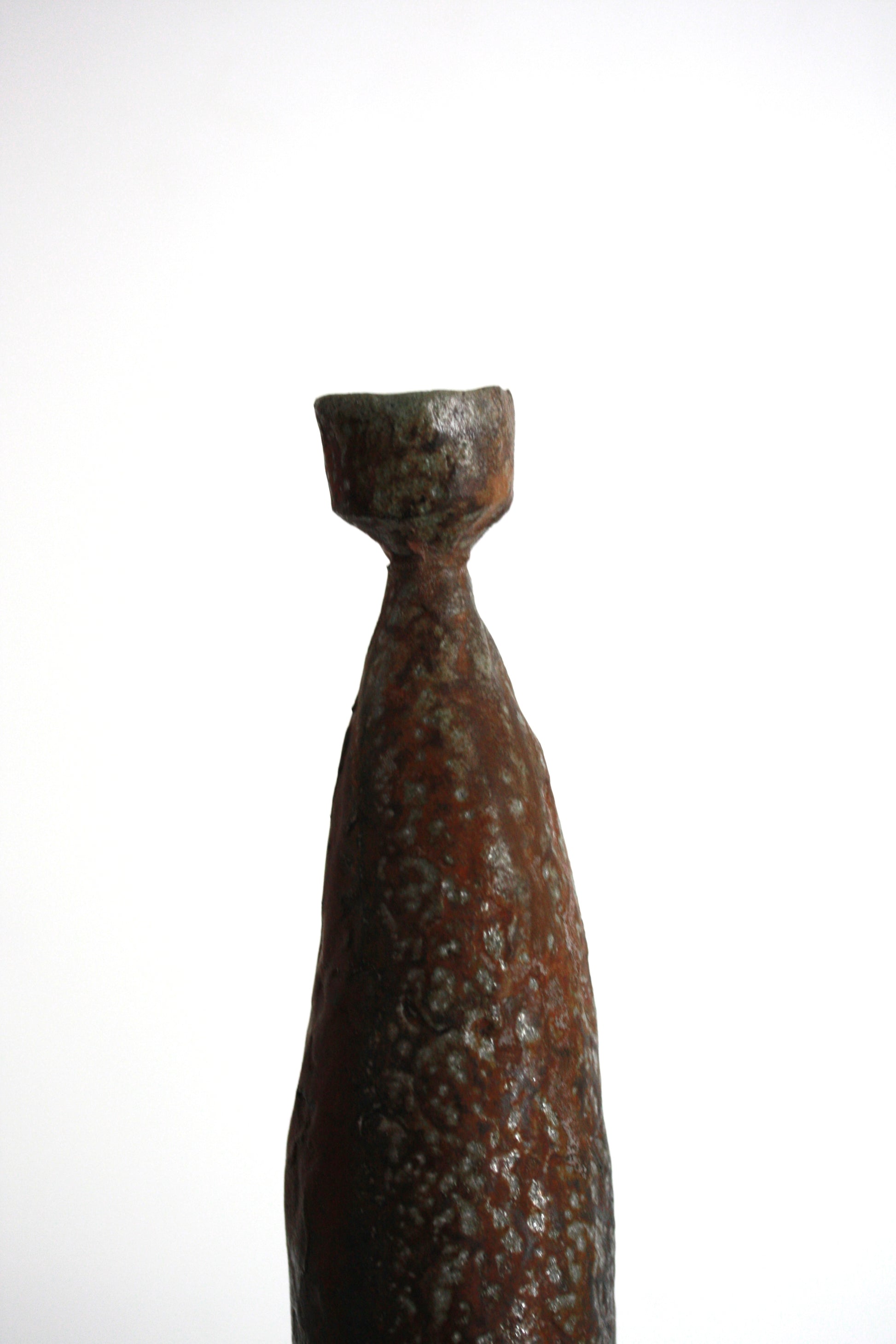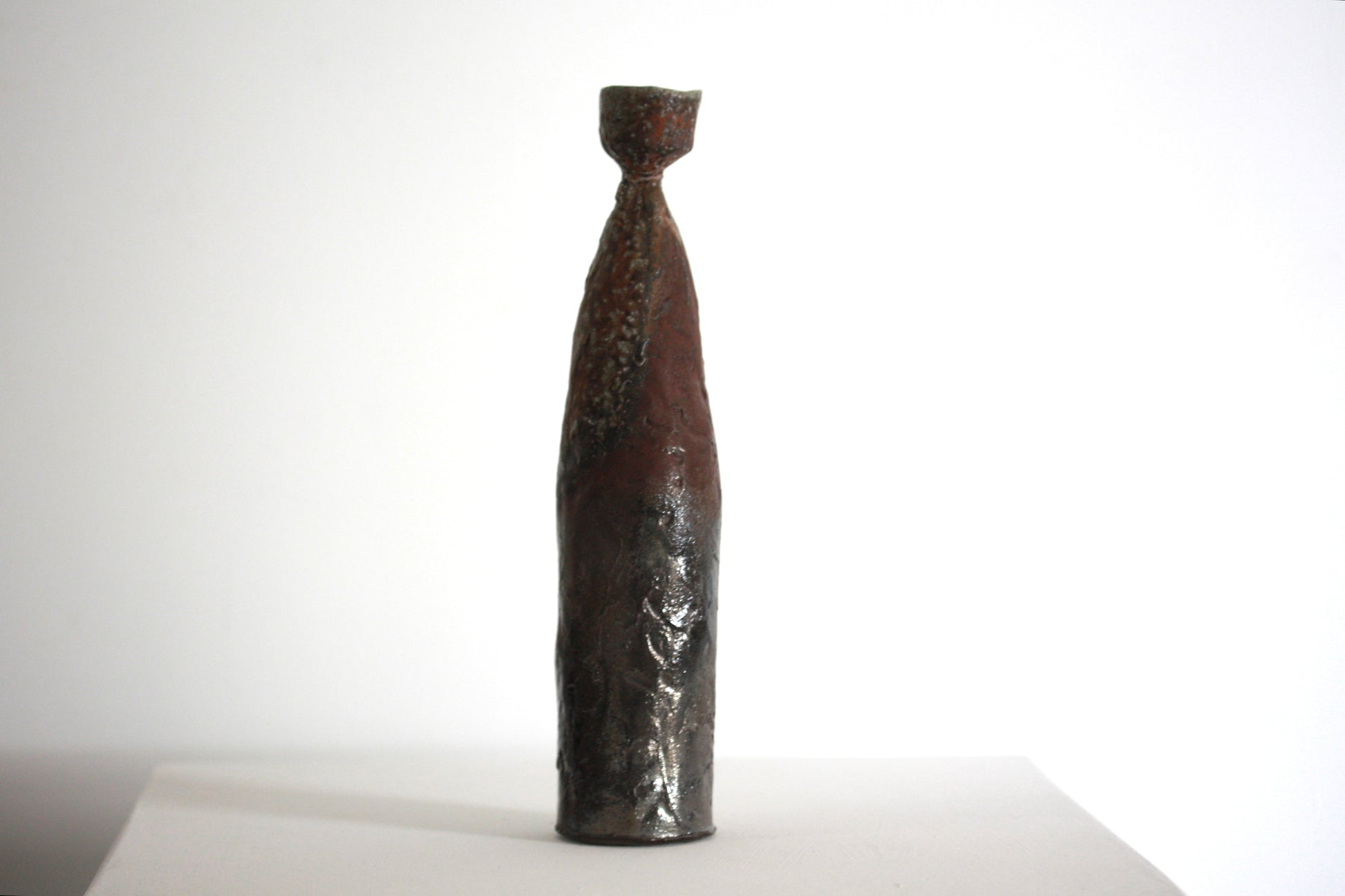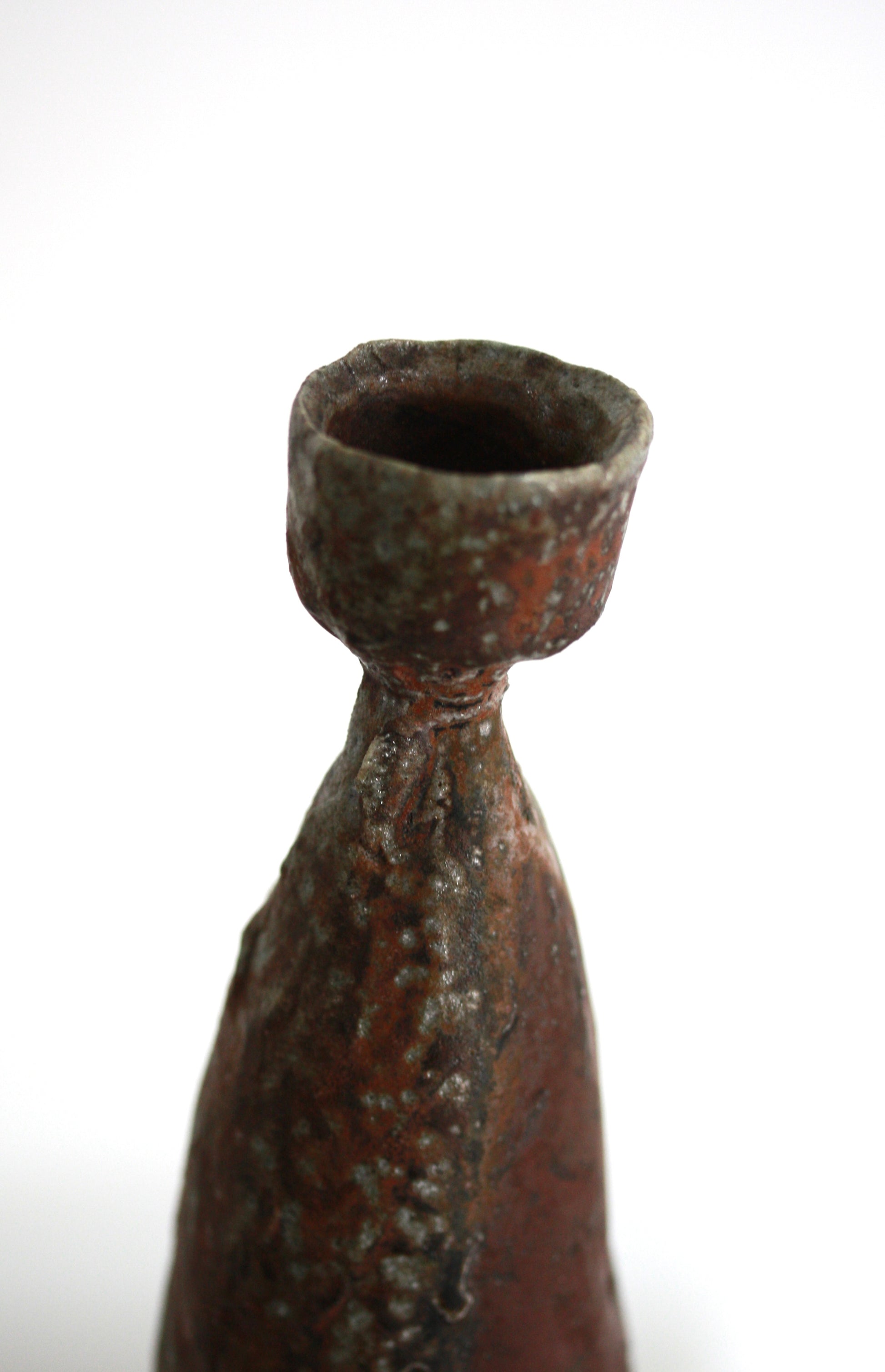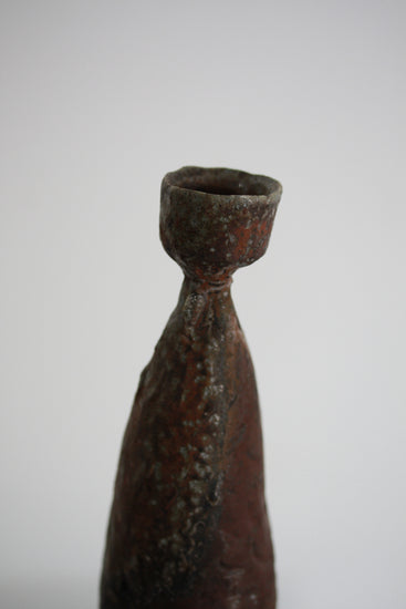 Coil built candlestick in stoneware clay. Wood fired in an Anagama kiln and reduction cooled.