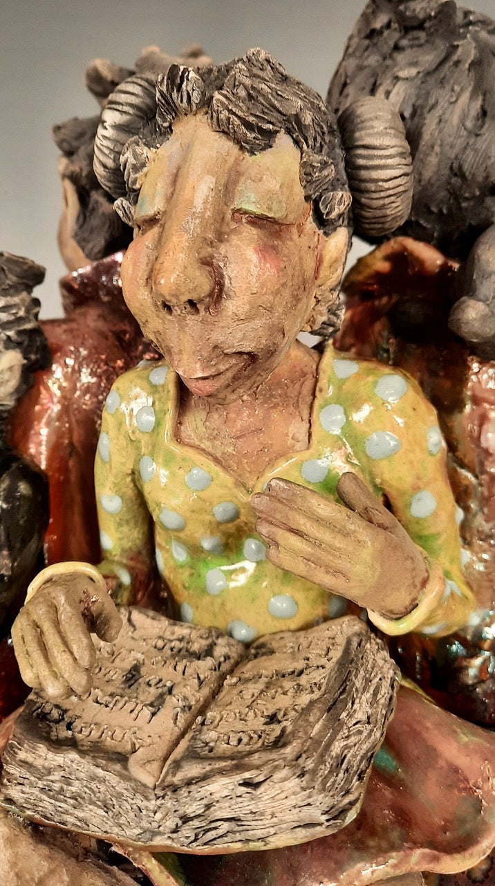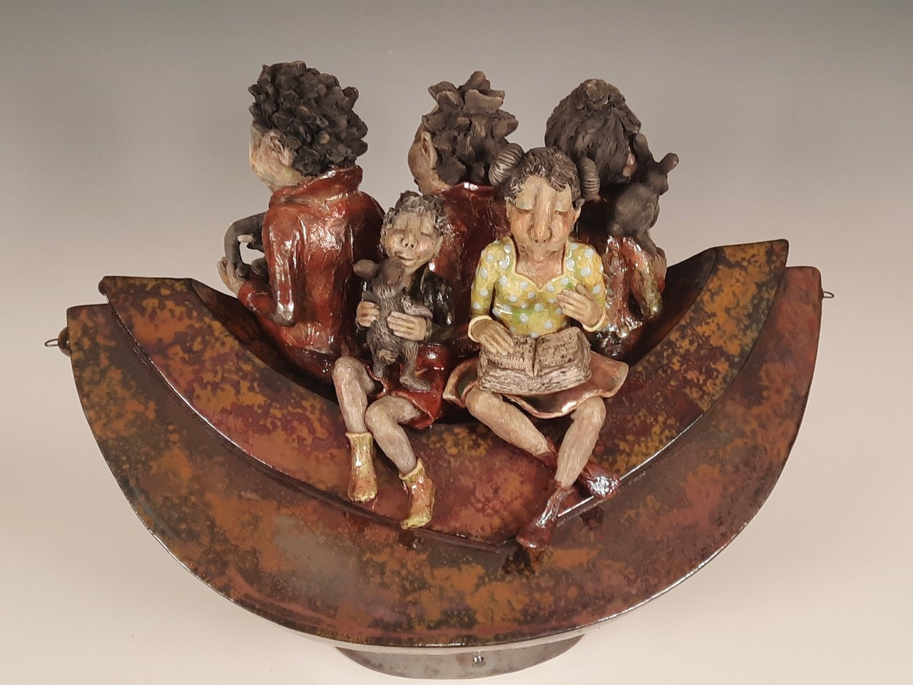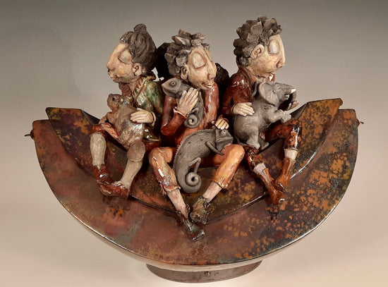 In “Caretakers“ the lidded vessel reimagines the ceramic box as a profound metaphor, no longer merely functional, but a symbolic foundation that cradles not just figures, but ideas, memories, and responsibilities. In this piece the humans gently embrace animals, expressing empathy, protection, and a longing to understand other lives. One figure reads quietly, suggesting that knowledge deepens connection and responsibility.