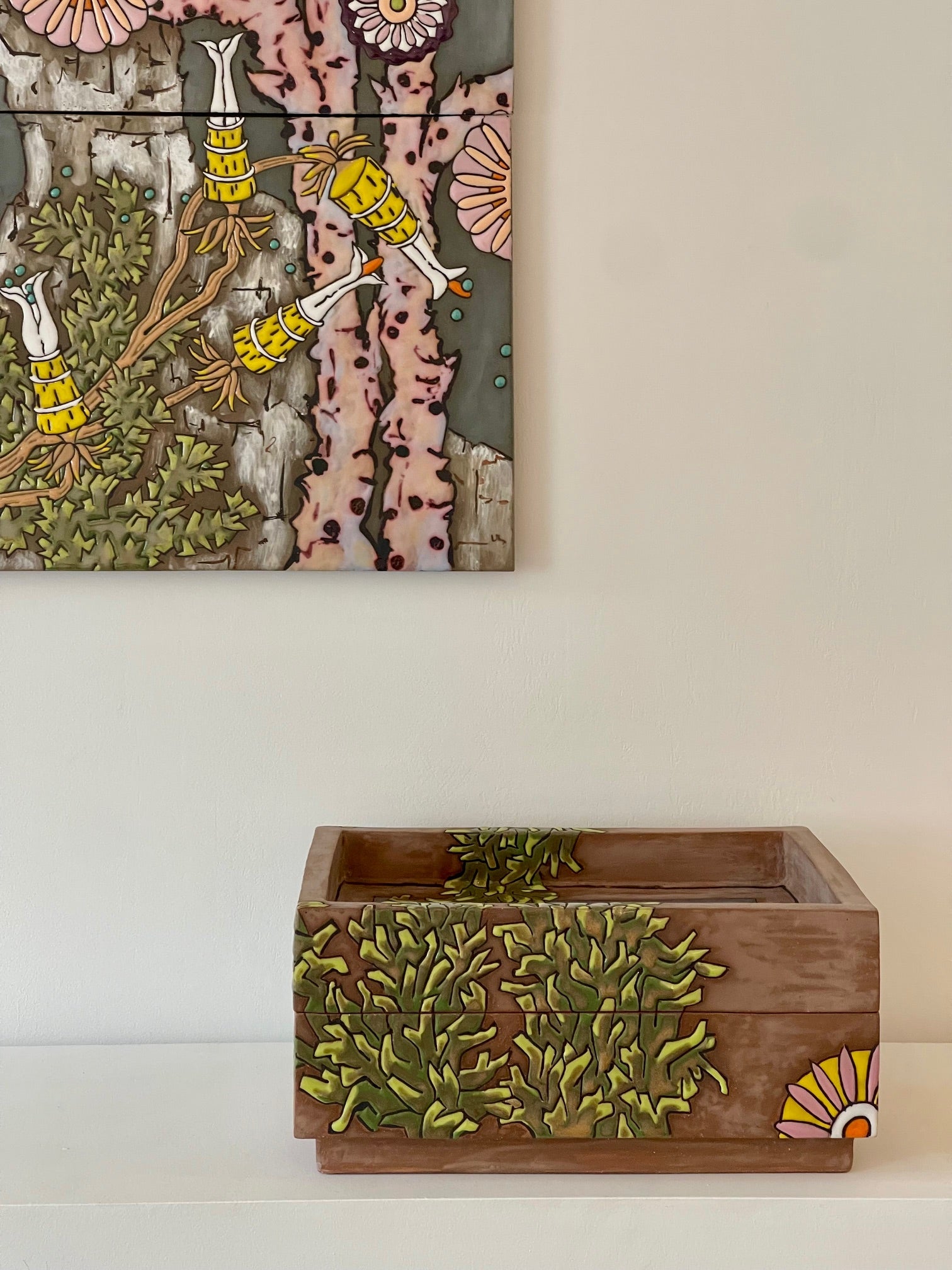 offers a stage for arranging objects for reflection and observation. The tile panel is the outcome of this exploration of hybrid imagery, blending plant and manufactured form, translating the objects into illustration in glaze that combines botanical representation and decorative abstraction.
