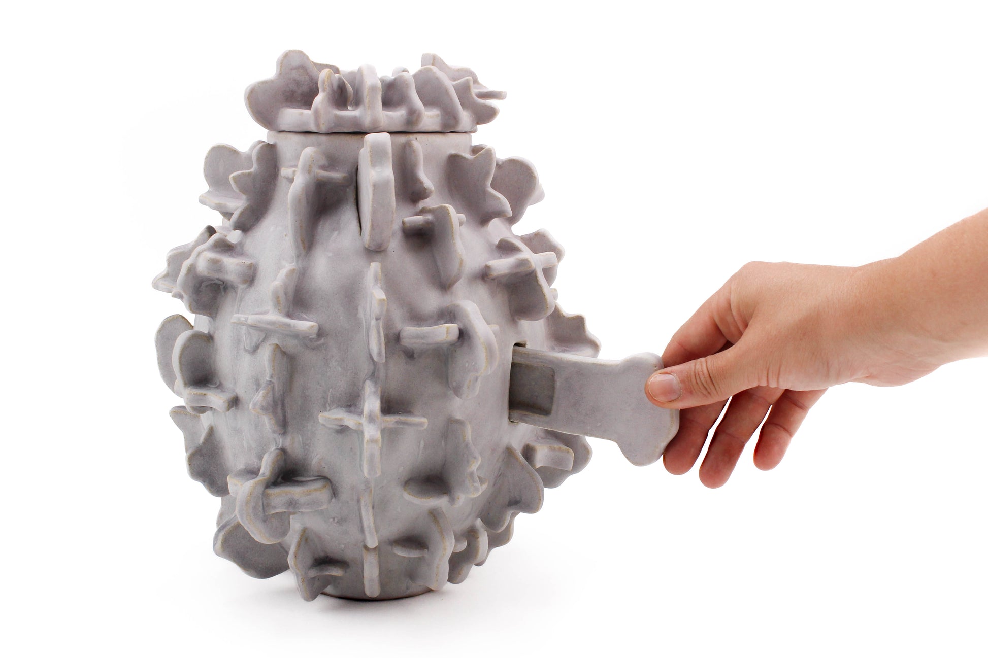 I build interactive ceramic jars and furniture to conceal items commonly used by myself, and people back hundreds of years that may now or one day be illicit: contraceptives, abortifacient herbs, recipes, books. The floral patterns protect the sculptures by harnessing the usual dismissal of decoration and femininity throughout history. I offer my inherited secrets and stories for a future generation.