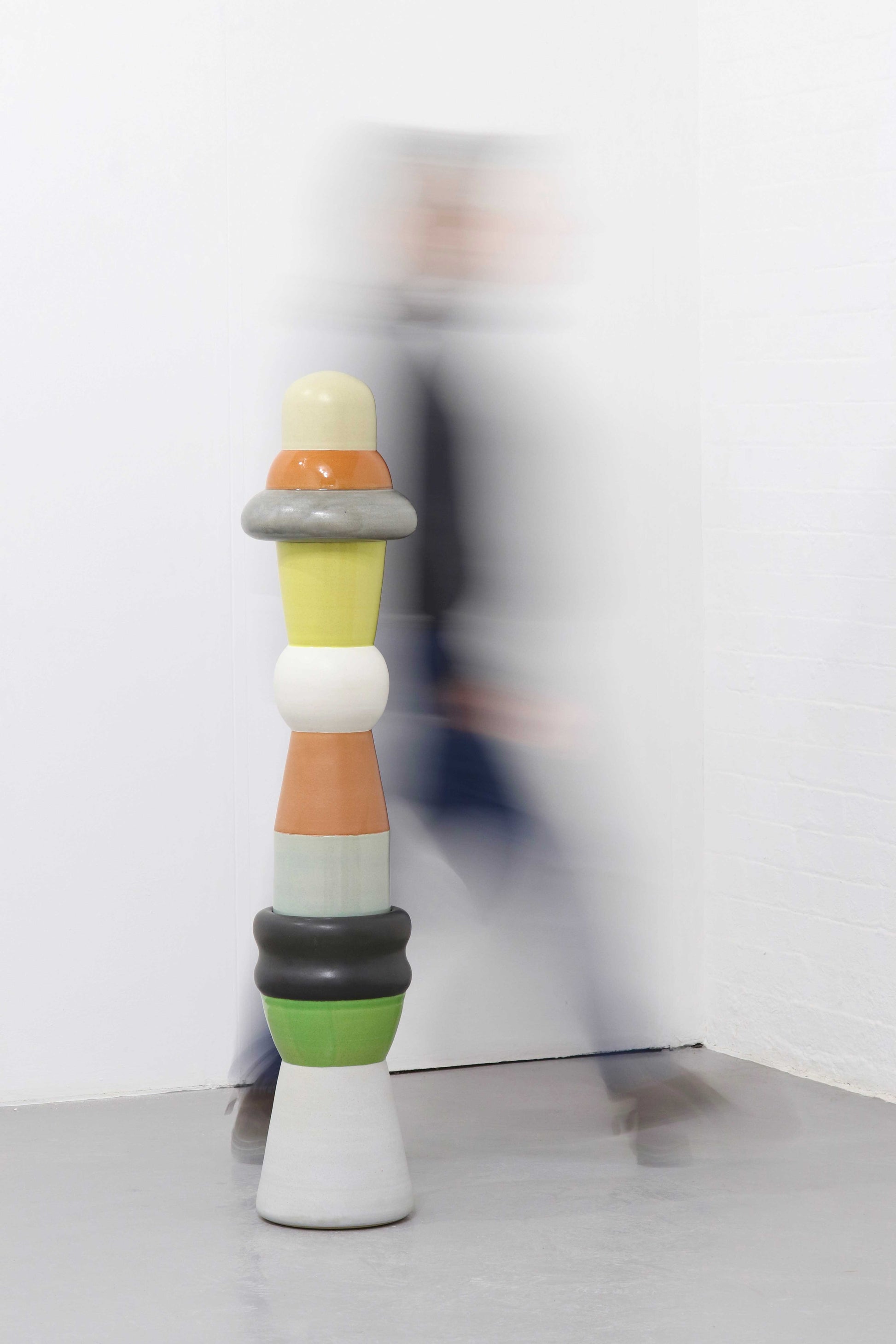 Although the artist often refers to her stacked ceramic sculptures with the nickname ‘totems’, the series is actually called ‘The Follies’. It references a text written by the 16 th century writer Erasmus – In Praise of Folly (Translation by John Wilson). ‘Folly praises herself endlessly arguing that life would be dull and distasteful without her”.