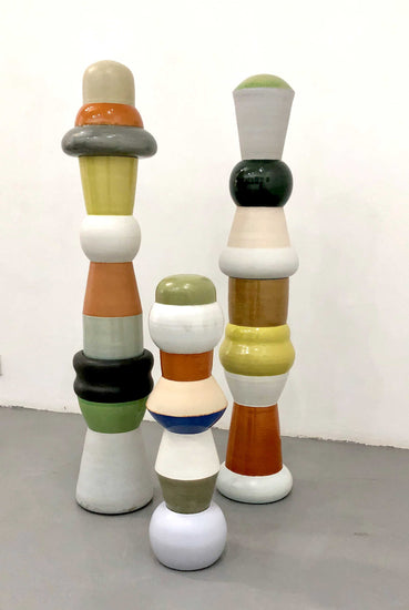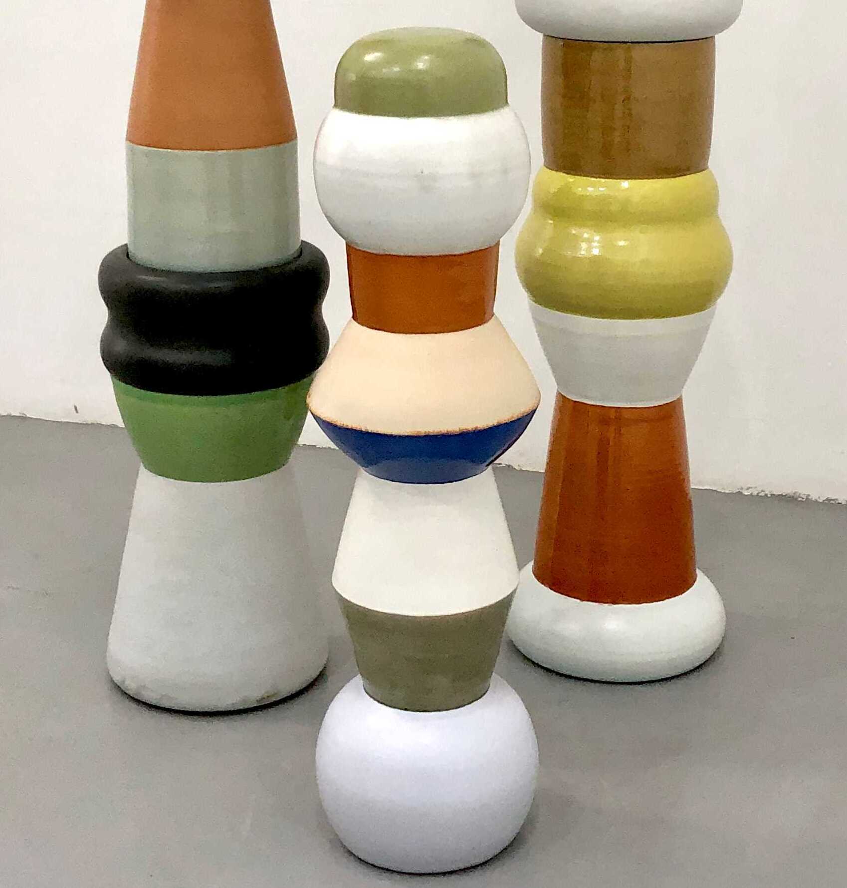 Although the artist often refers to her stacked ceramic sculptures with the nickname ‘totems’, the series is actually called ‘The Follies’. It references a text written by the 16 th century writer Erasmus – In Praise of Folly (Translation by John Wilson). ‘Folly praises herself endlessly arguing that life would be dull and distasteful without her”.