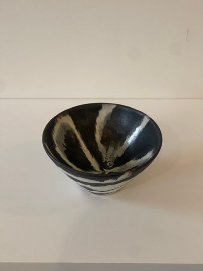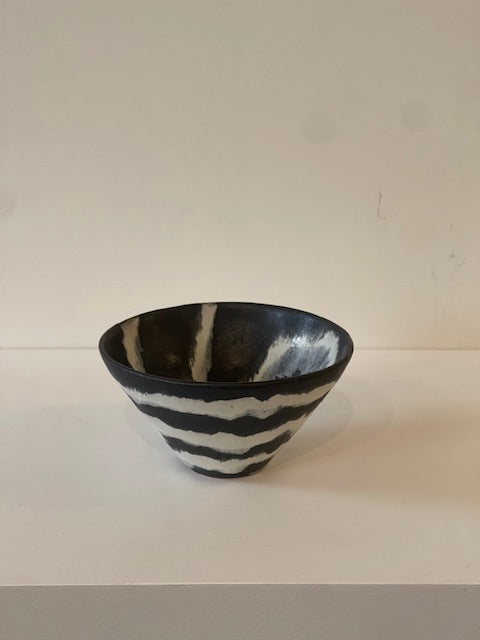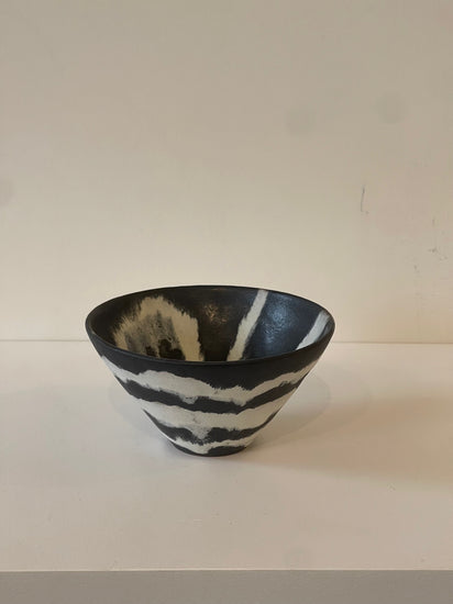 This series of sculptural, hand-built vessels is titled, "The Haring-ish(es)" and draws from the graphic language of artist, Keith Haring. Expressive lines, rhythmic contours and symbols speak across language and culture as Haring had the ability to communicate through deceivingly simple and charming iconography. Neish wraps this graphic energy around a conical form, letting the vessel’s natural swirl become part of the artwork’s movement within the image and space itself.