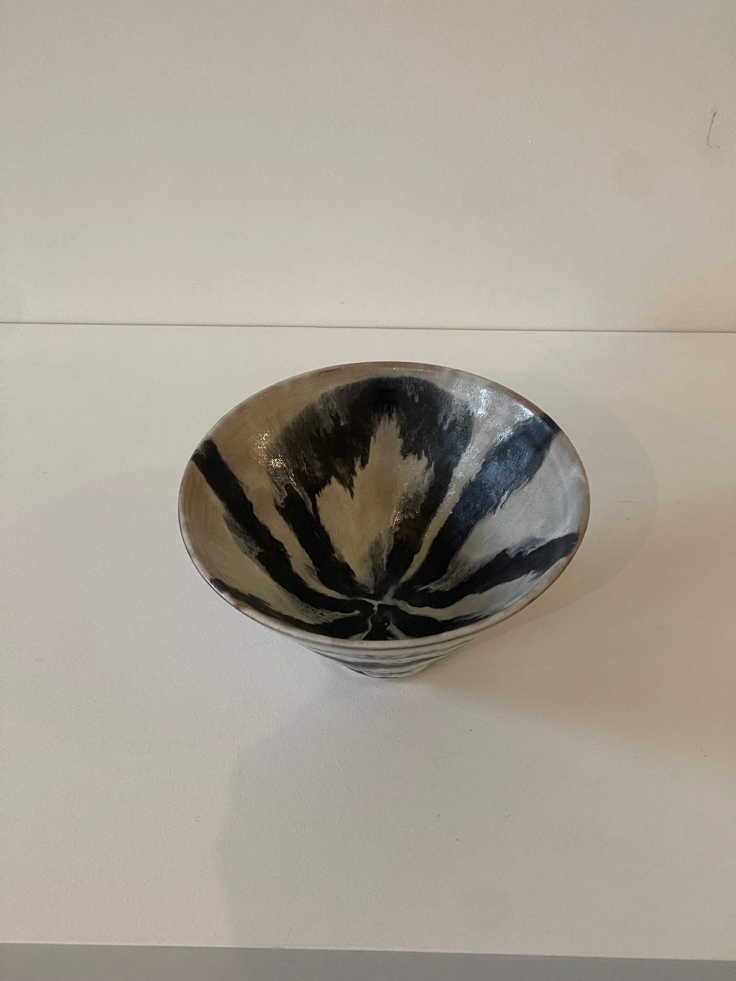 The Haringishes series of porcelain and stoneware vessels has resulted from contemplating the graphic language of Keith Haring, its ability to communicate through deceivingly simple and charming iconography in fluid negative and positive space. The Haringishes vessels are often conical in shape reminding one of a water whirling in a whirlpool. By employing the natural flowing form of these vessels as three-dimensional canvases, the aim is to enhance the perception of movement within the image and space itself.