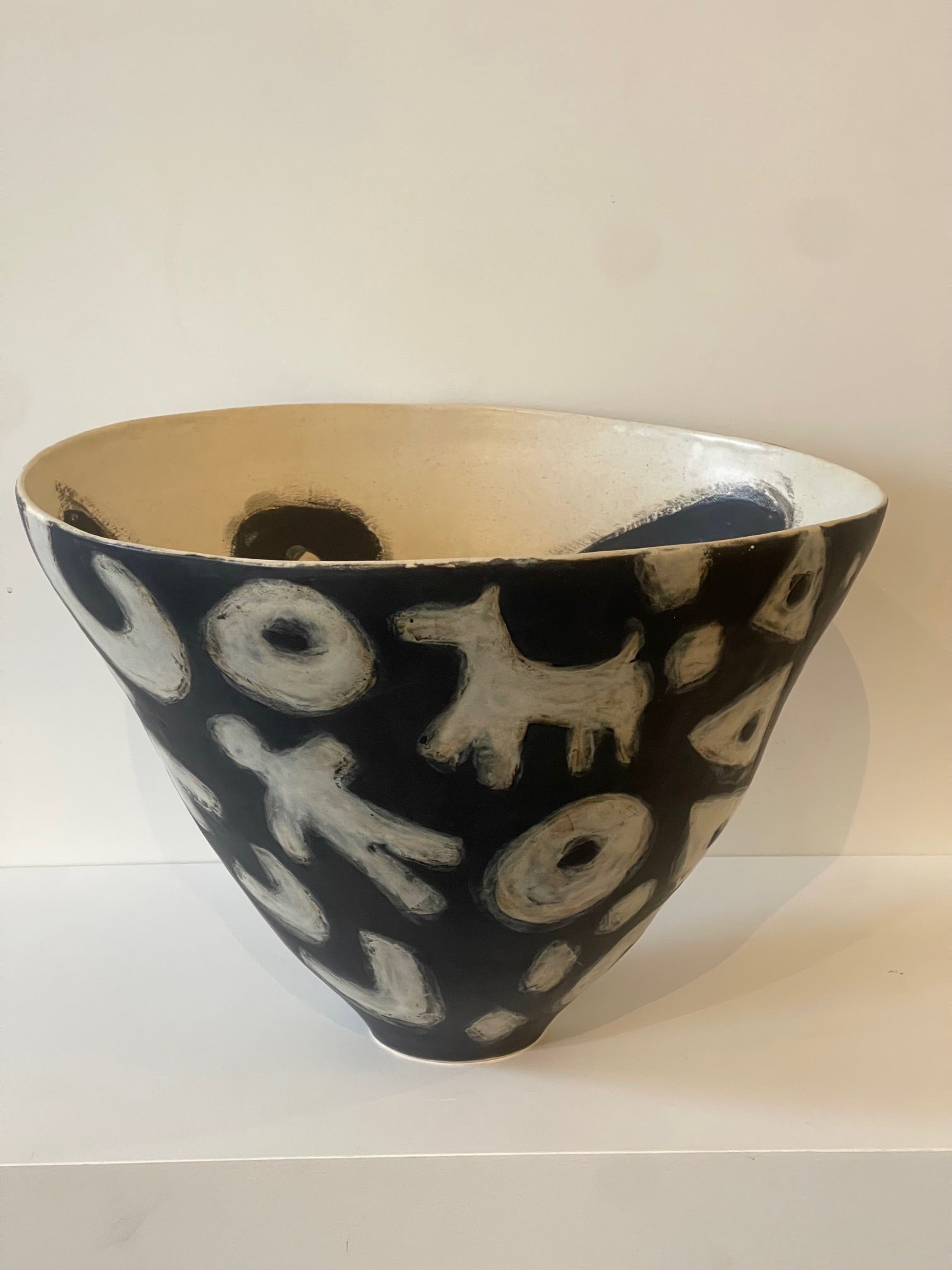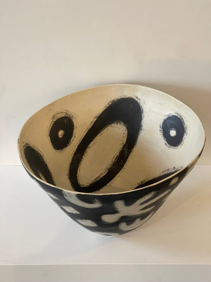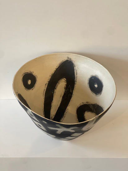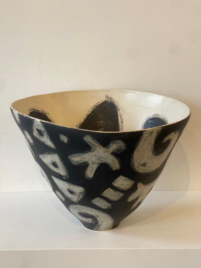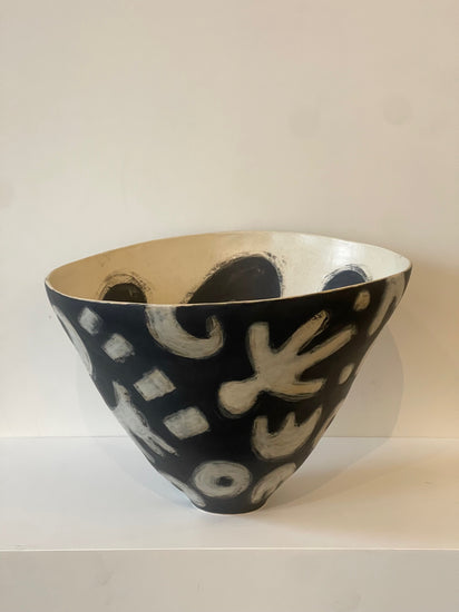 This series of sculptural, hand-built vessels is titled, "The Haring-ish(es)" and draws from the graphic language of artist, Keith Haring. Expressive lines, rhythmic contours and symbols speak across language and culture as Haring had the ability to communicate through deceivingly simple and charming iconography. Neish wraps this graphic energy around a conical form, letting the vessel’s natural swirl become part of the artwork’s movement within the image and space itself.