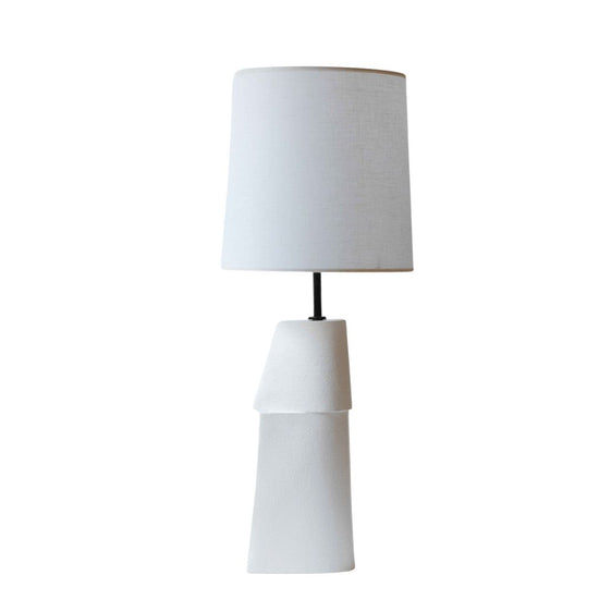 Sculptural table lamp with subtle ribbed texture in earthenware and soft- sheen terra sigillata. Slab-built.