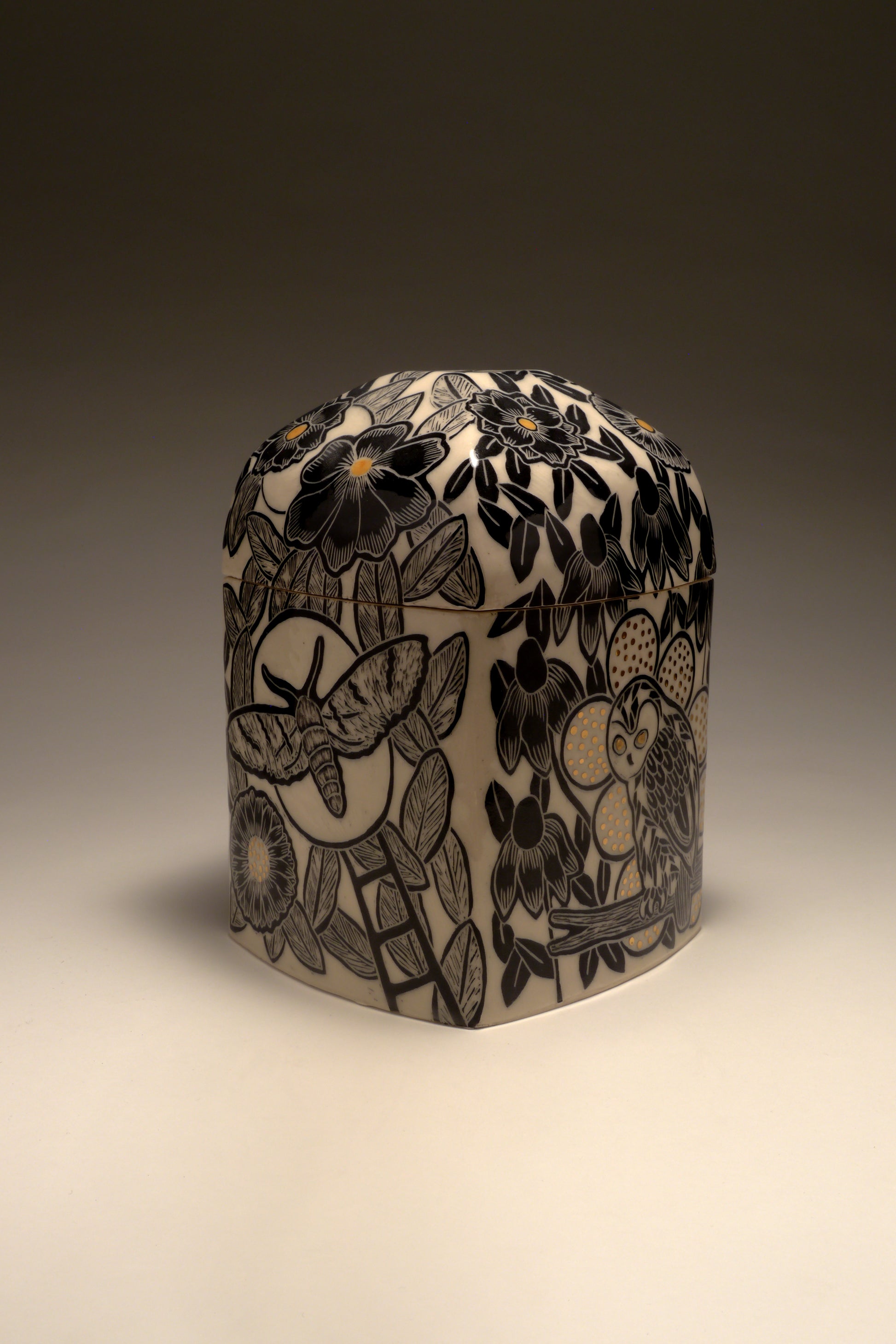 I have always used the ceramic vessel as a canvas for images mined from my Catholic upbringing, childhood memories, religious iconography, and plants and animals. As the imagery is carved onto the surface, a nascent story begins to emerge. I combine the visual elements intuitively and leave most of the narrative contemplation to outside interpretations.