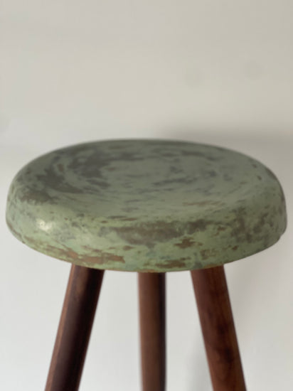Patina green matte glazed stoneware top side table with solid walnut wood turned legs in tripod configuration.