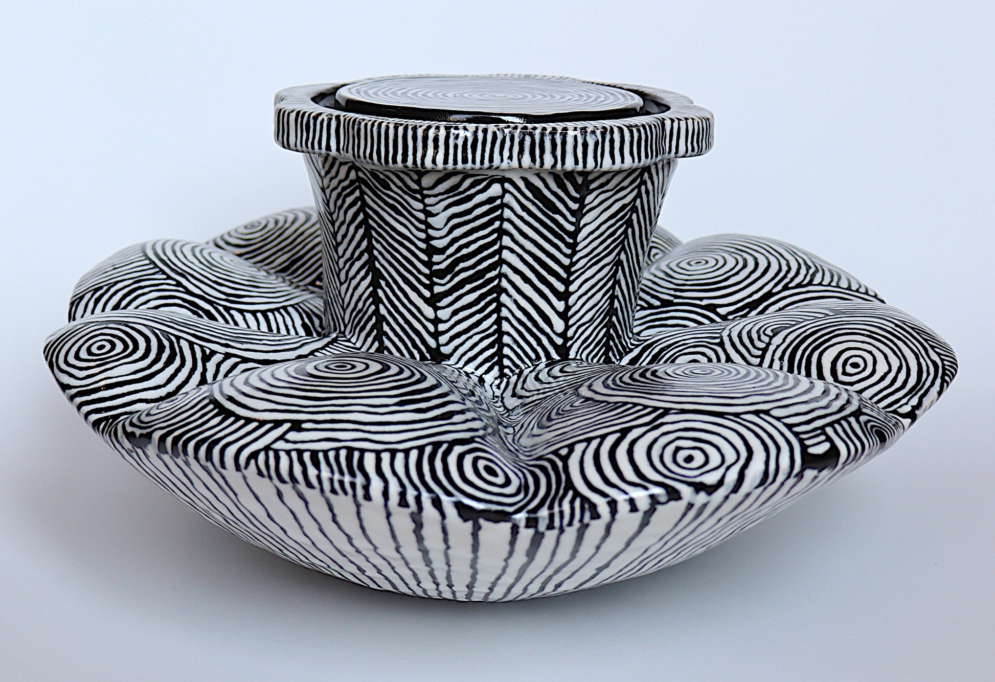 For me, making a lidded container requires a precise intent unique to this form. The challenge lies in ensuring body and lid not only meet physically, but also complement one another in a sculptural dialogue. These containers are inspired by floral motifs, drawn first as lines, then translated into three-dimensional volumes. Their surfaces are built from thinly extruded lines of glaze, applied side by side, melting into one another until they become intricate patterns born of repetition. In this way, each container carries both the discipline of precision and the looseness of organic rhythm, holding not only what is placed within, but also the gestures of making itself.