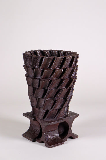 This vessel was constructed using a custom extruder profile developed by the artist. The base is formed from this profile at full scale, a geometry that appears across related works. The upper structure, however, is built from a scaled-down version of the same extrusion. These reduced elements were meticulously woven and stacked in concentric rings to generate the vessel’s irregular, architectural form. The lip was then carefully levelled, revealing a clean cross-section that exposes the internal logic of the construction.