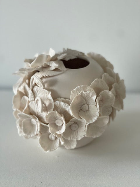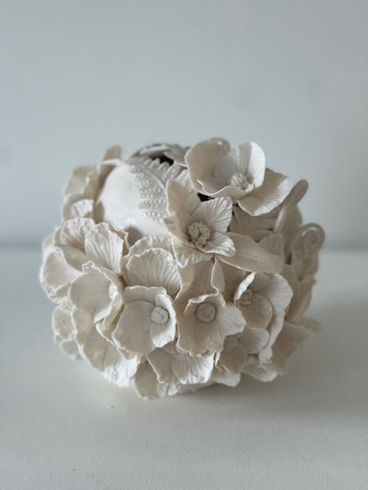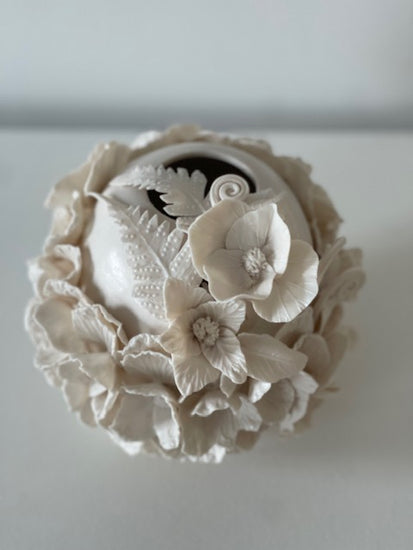 Contemplating the natural world is my main source of inspiration. My imaginary porcelain flowers have printed patterns made with leaves that I collect during my botanical expeditions in Colombia’s endangered páramos and forests. Many of the animals and plants that I paint with watercolour glazes are invented, as I imagine them travelling from these ecosystems to mine. My material itself, clay, comes from the Earth’s crust. As I hand-build and glaze my work, and as I adapt to the cracks and drips caused by the firing process, I contemplate the fragility of these ecosystems, their resilience in the face of constant abuse, and the generosity of their shapes, colours and textures. I try to celebrate the strength of women, whose stories so often go untold. First among them is that of my mother, who transmitted me her passion for beauty when caring for her garden, baking cakes with ornate pastillage, creating floral arrangements, and ceaselessly collecting porcelain from great factories such as Limoges, Bavaria, Rosenthal, and Royal Doulton.