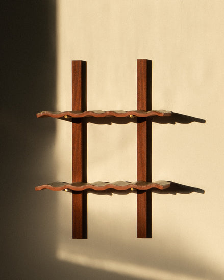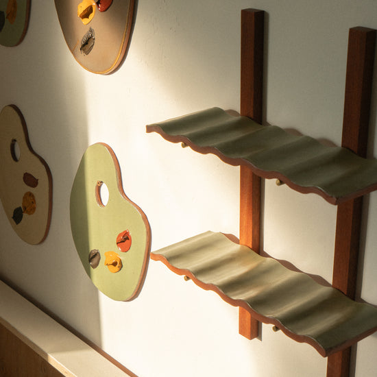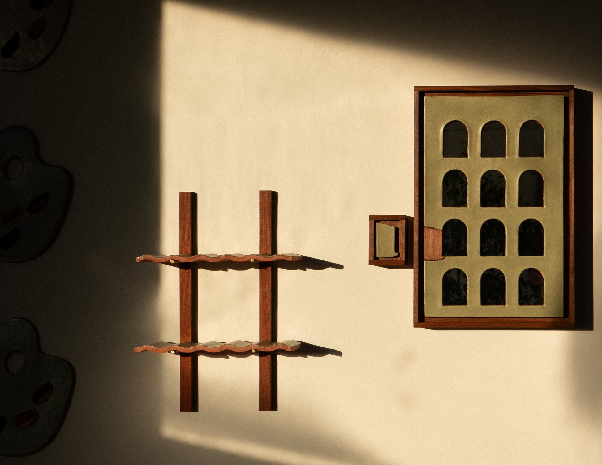 These shelves seamlessly blend wood and clay, combining playful, surrealist forms with a touch of Japanese inspiration. The design emphasizes harmony and balance, showcasing organic shapes and a refined aesthetic that bridges functionality and artistry.
