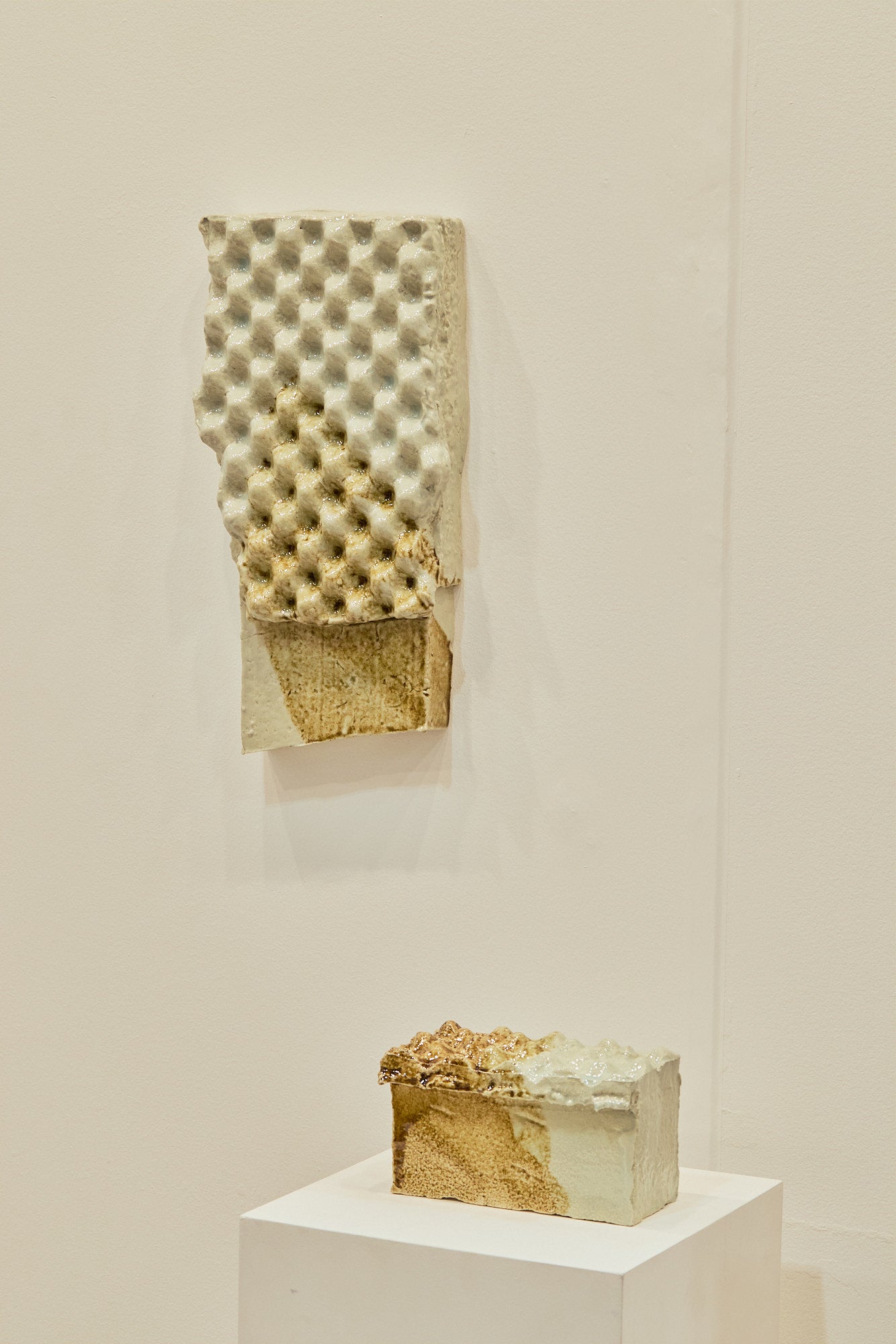 Madeiski’s process begins with ephemeral assemblages of foam and fragments, which she casts into plaster and then ceramic, preserving their textures and imperfections. The foam, reminiscent of insulation or acoustic panelling, introduces a material ambiguity—something soft made hard, something designed to absorb now rendered to endure.