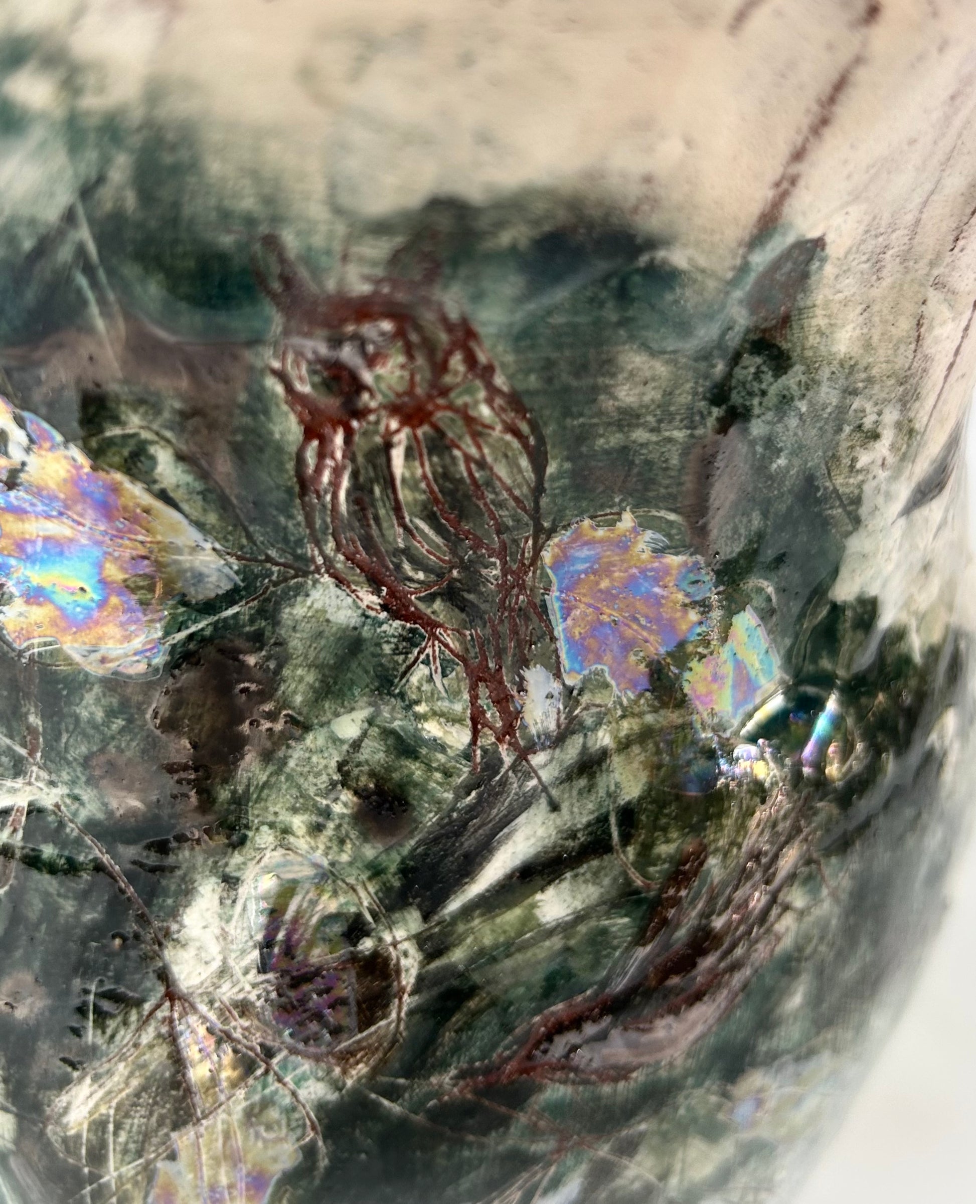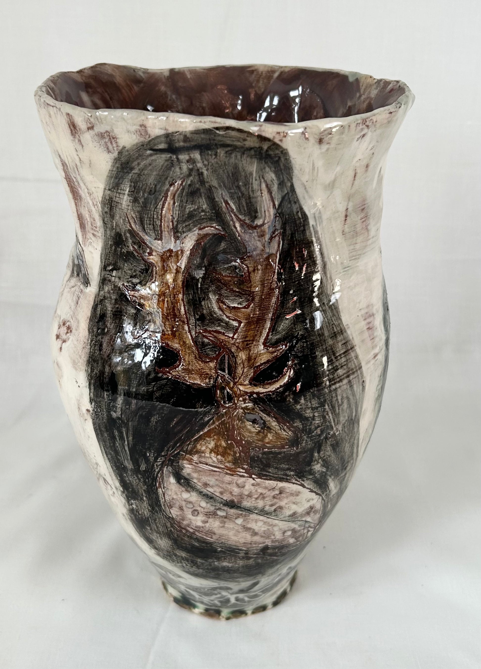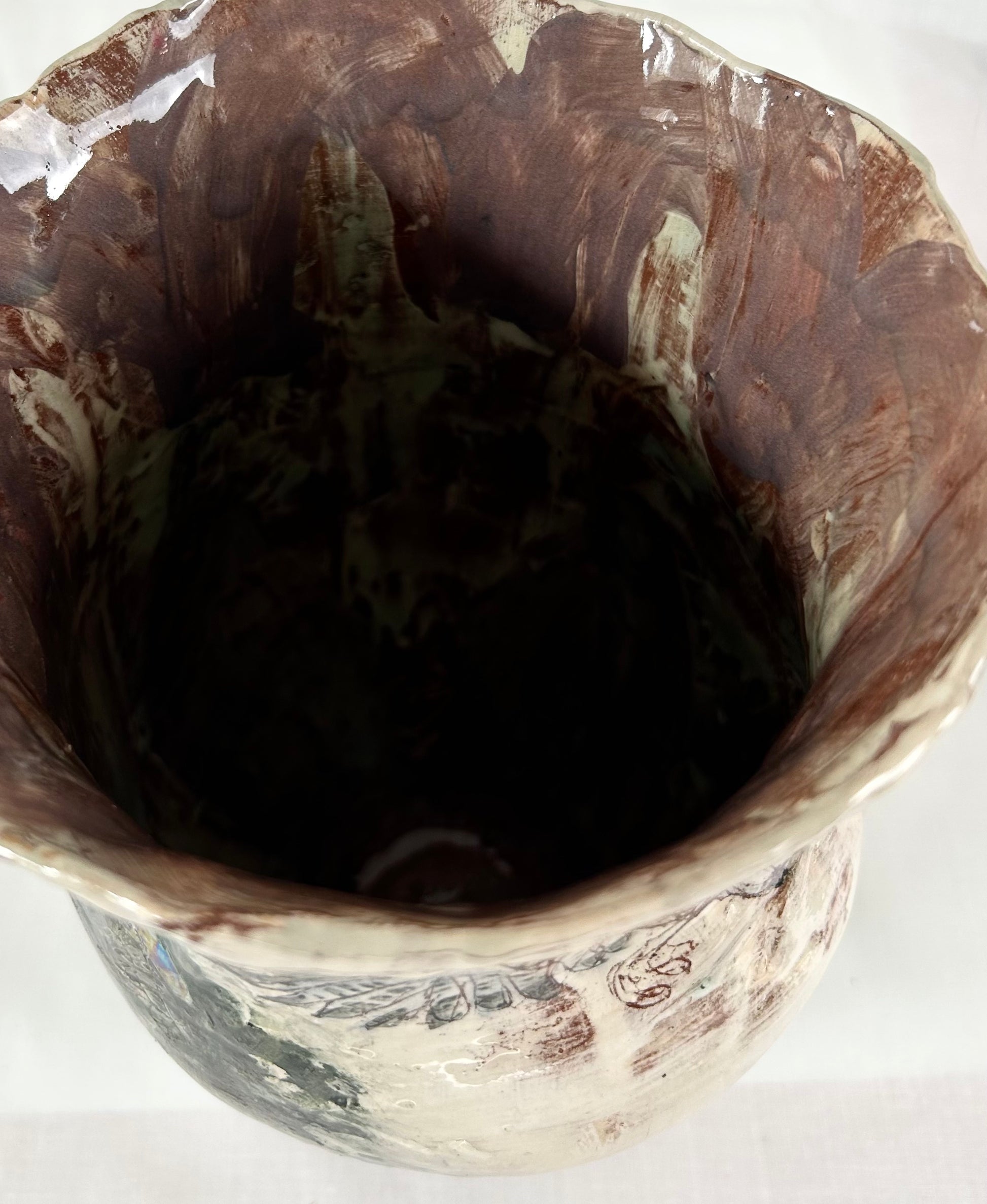Hand built earthenware vessel multi-layered with glaze, underglaze and slips. Images are drawn using Sgraffito (a scratching technique that reveals layers of underglaze beneath the surface glaze).