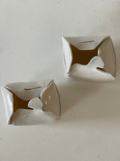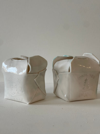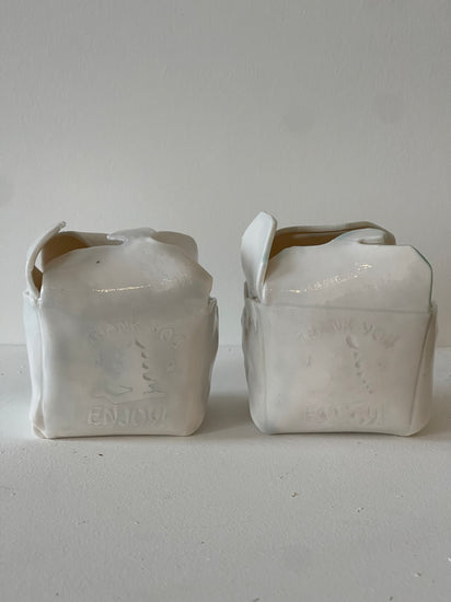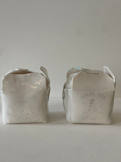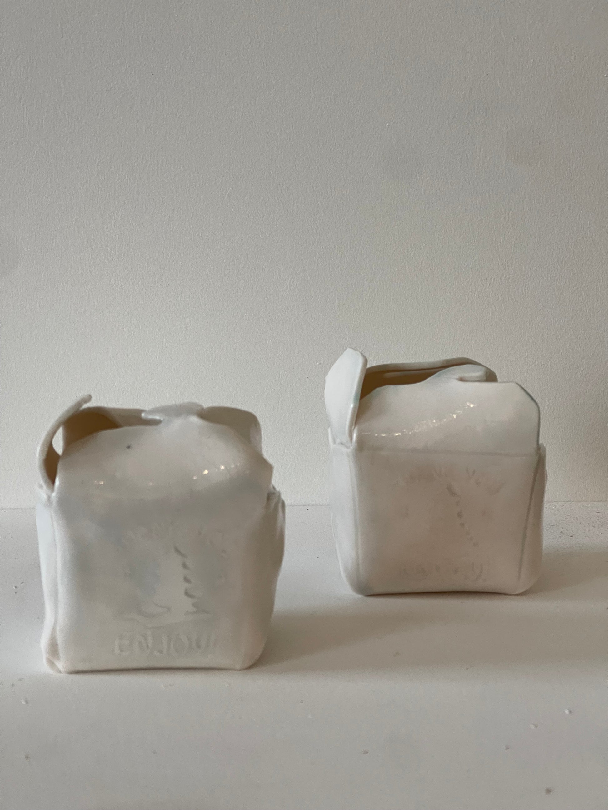 We spend years developing an artistic style that feels true to us, a way of working that others recognize and that, over time, becomes its own kind of “box.” It is comfortable, familiar, and safe, but it can also feel limiting. The pieces in What Holds play with this idea, questioning how creativity can escape containment. These ceramic “take-out” boxes, glowing as if light is spilling from within, become whimsical metaphors for ideas pushing against boundaries, searching for freedom beyond their container.